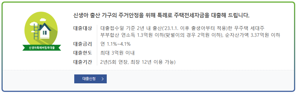신생아(출생 후 1년 이내)를 둔 가구를 대상으로 특별 지원되는 전세자금 대출 상품입니다.